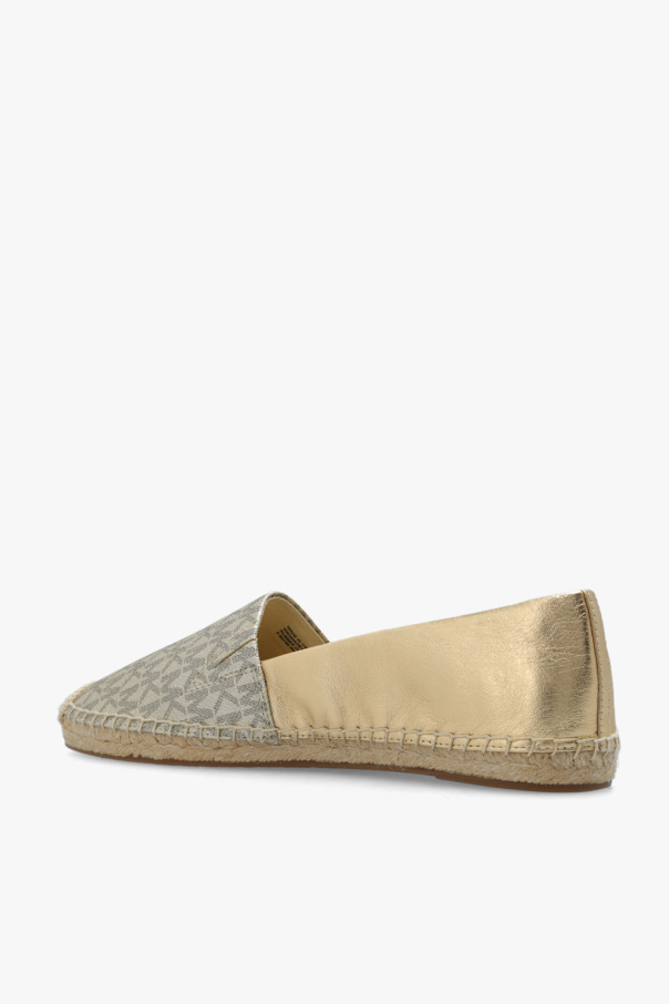 Gold-tone ‘Kendrick’ espadrilles from Michael Michael Kors. Made of leather with monogram canvas, this model is complete with a logo detail and brown sole constructed with rubber and woven jute.