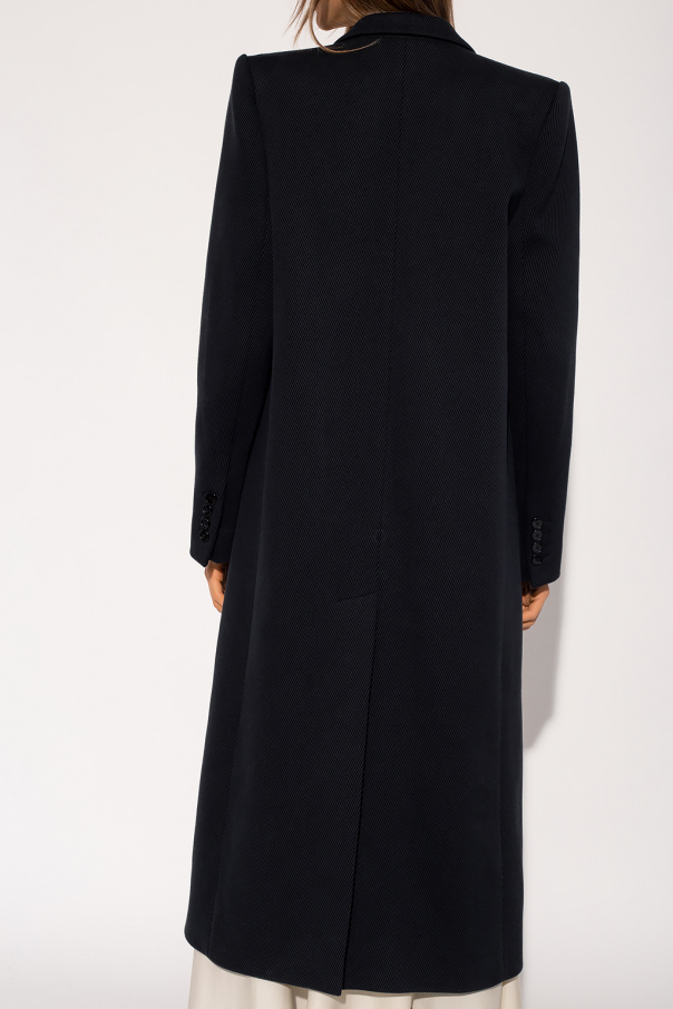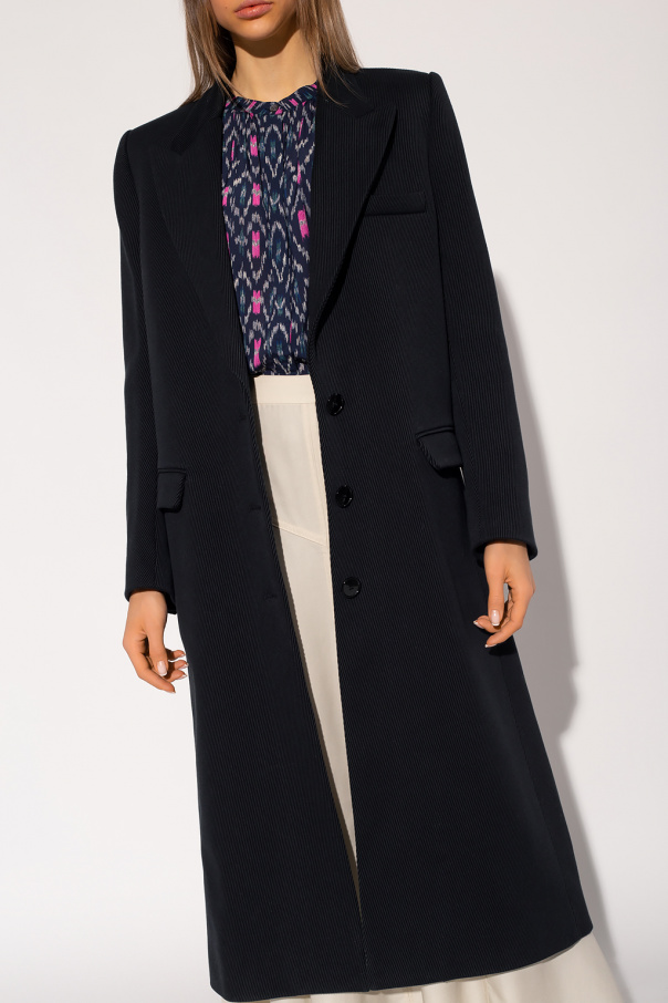 Black ‘Giboleen’ ribbed coat from Isabel Marant. Crafted from a cotton and wool blend, this garment features button fastenings, two flap pockets, one slip pocket, single rear vent, peak lapels and button cuffs.