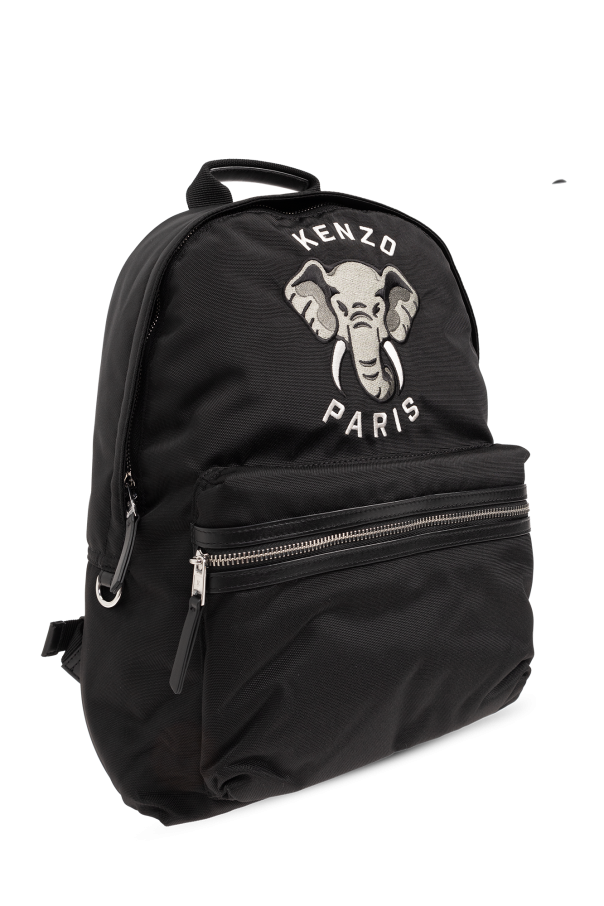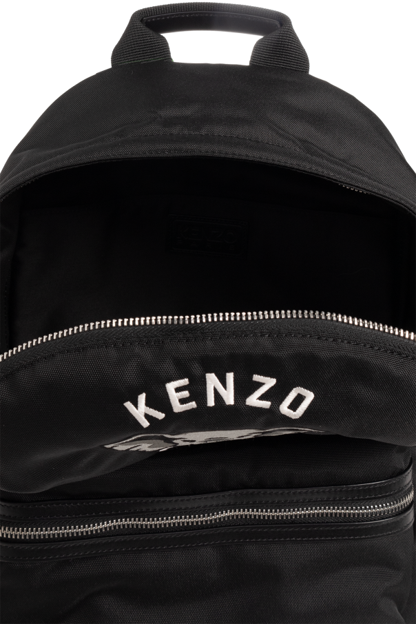 Black backpack from Kenzo. Fastened with a two-way zip, this design features a grey, black and white logo embroidery, the brand\'s signature tiger head, zipped front pocket, half-round handle, adjustable shoulder straps, silver-tone metal hardware and one internal compartment with one slip pocket.