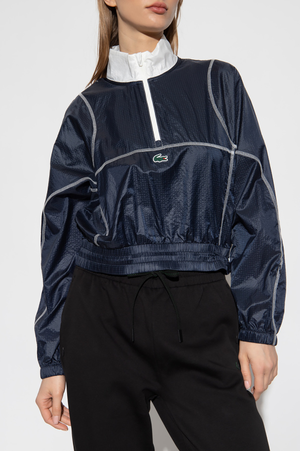 Navy blue and white jacket from Lacoste. Emblazoned with a logo patch for brand recognition, this style features a zip fastening, white stitching, a drawcord-adjustable hem and long sleeves with elasticized cuffs.