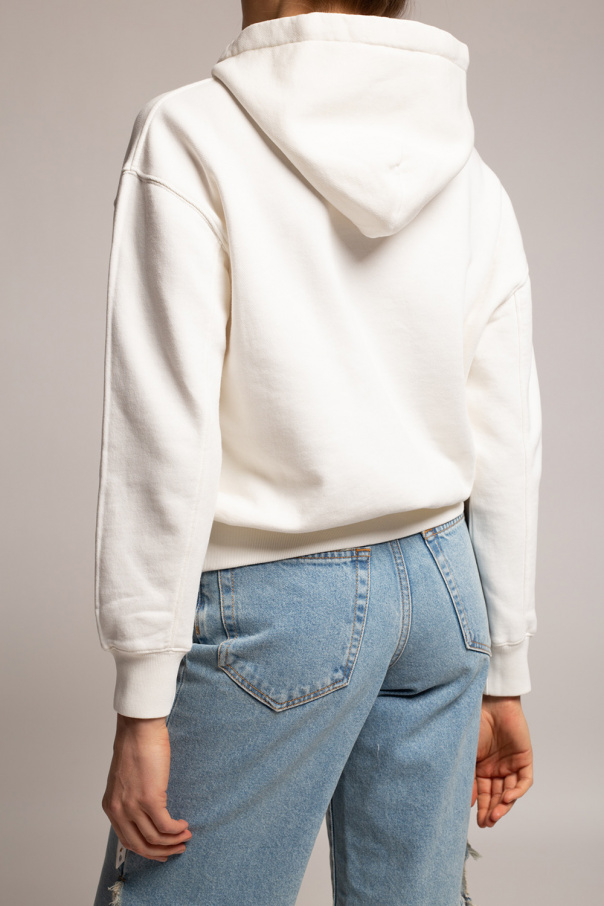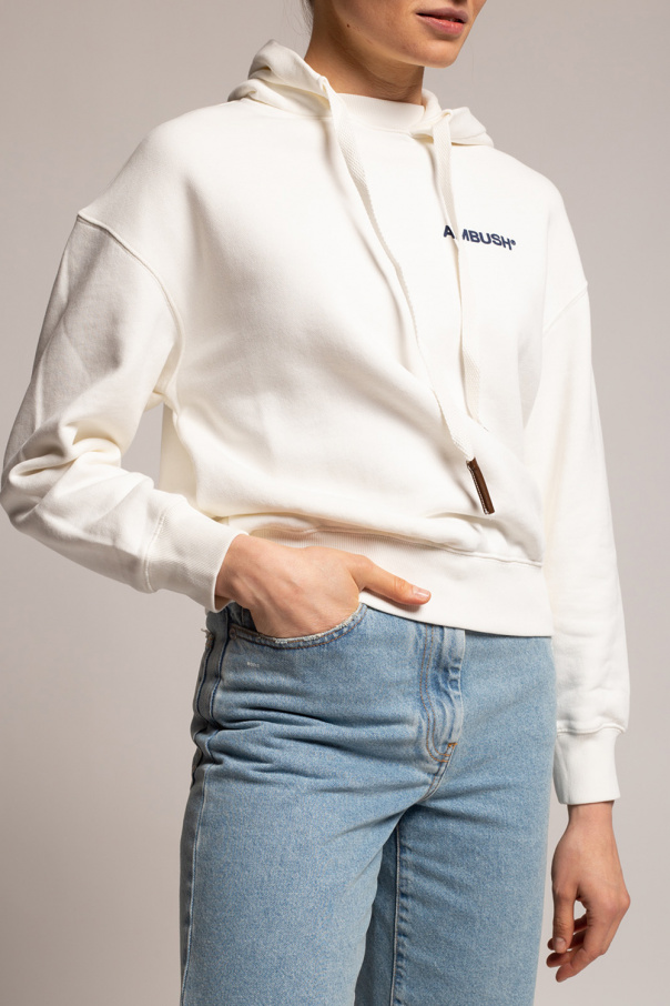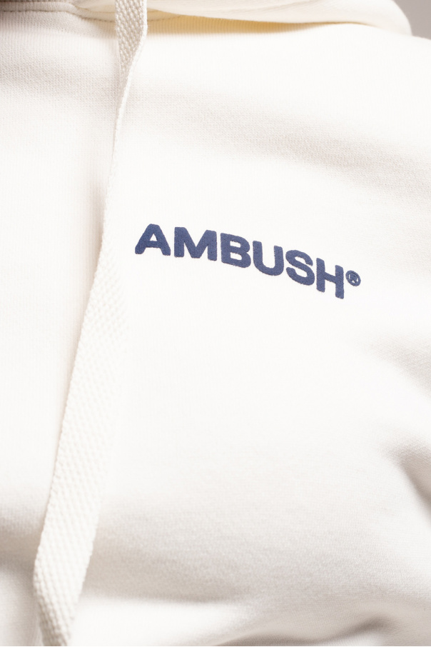White sweatshirt with a drawcord-adjustable hood from Ambush. Crafted from cotton jersey, this hoodie showcases a navy blue graphic print with the brand\'s logo and a ribbed bottom hem and cuffs.