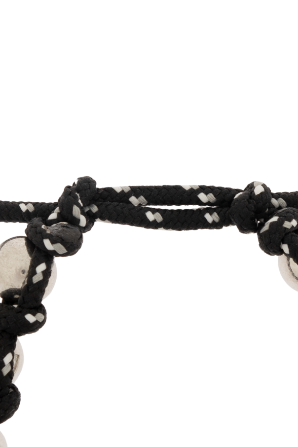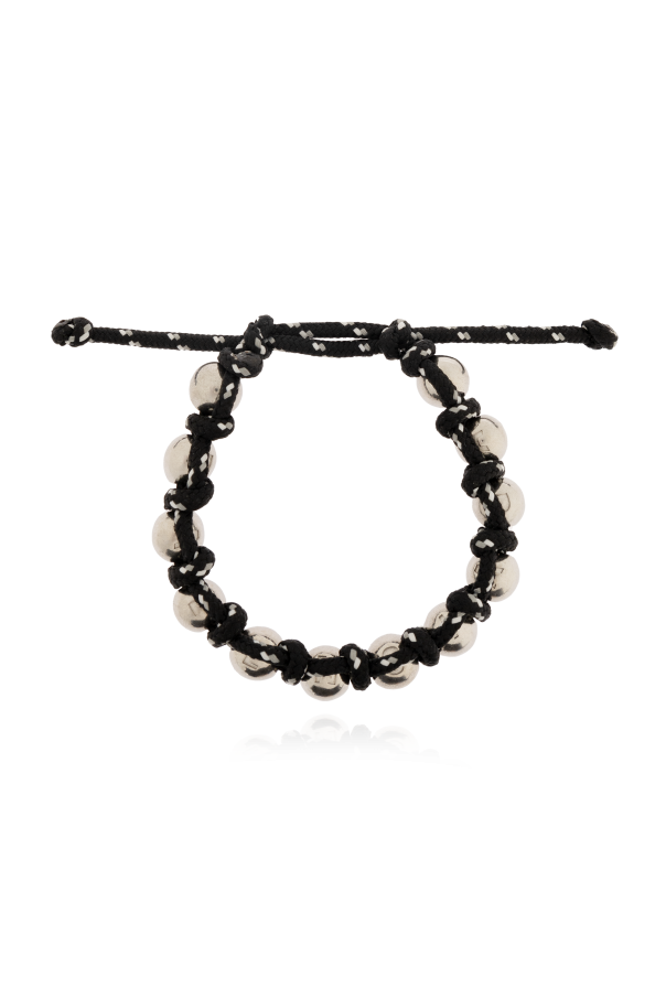 Introducing the Adjustable Bracelet by the illustrious house of Balenciaga, a masterpiece that embodies both modern elegance and timeless sophistication. Crafted with meticulous attention to detail, this bracelet features metallic spheres intertwined with a black, textured cord, creating a harmonious contrast that captivates the eye. Each sphere is meticulously polished, with selected ones engraved with letters, bestowing an exclusive character upon the piece. The bracelet\'s classic lobster clasp allows for adjustable length, ensuring a perfect fit for any wrist. The dominant black hue juxtaposed with the metallic sheen of the spheres offers a versatile accessory that seamlessly complements a myriad of styles. Why purchase this product? Exquisite craftsmanship by Balenciaga, a name synonymous with luxury. Unique design with engraved spheres for added personalization. Adjustable for a customizable fit. A versatile accessory that enhances any ensemble.