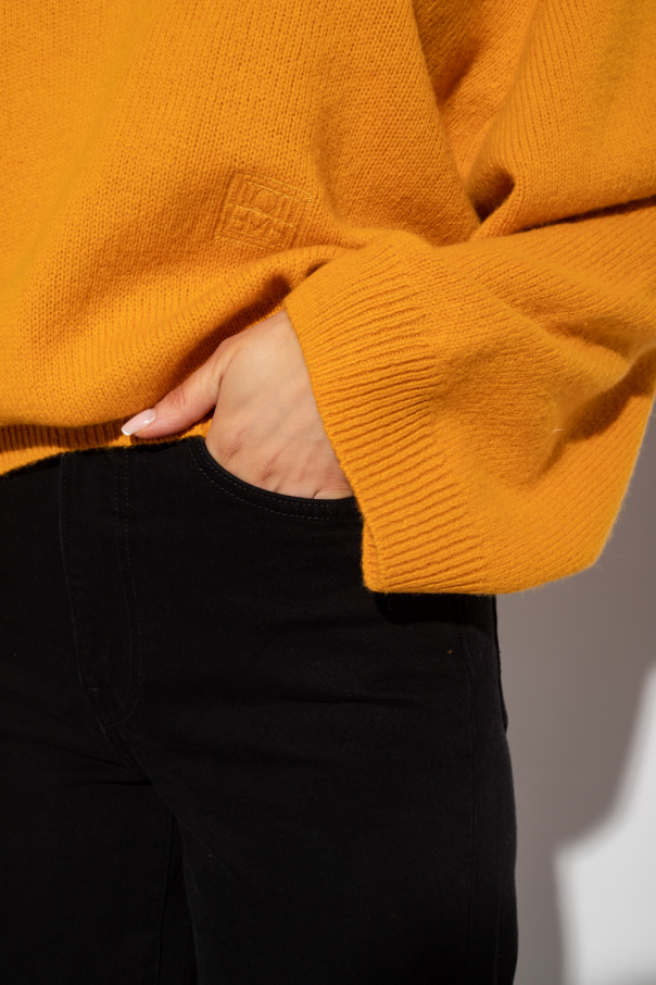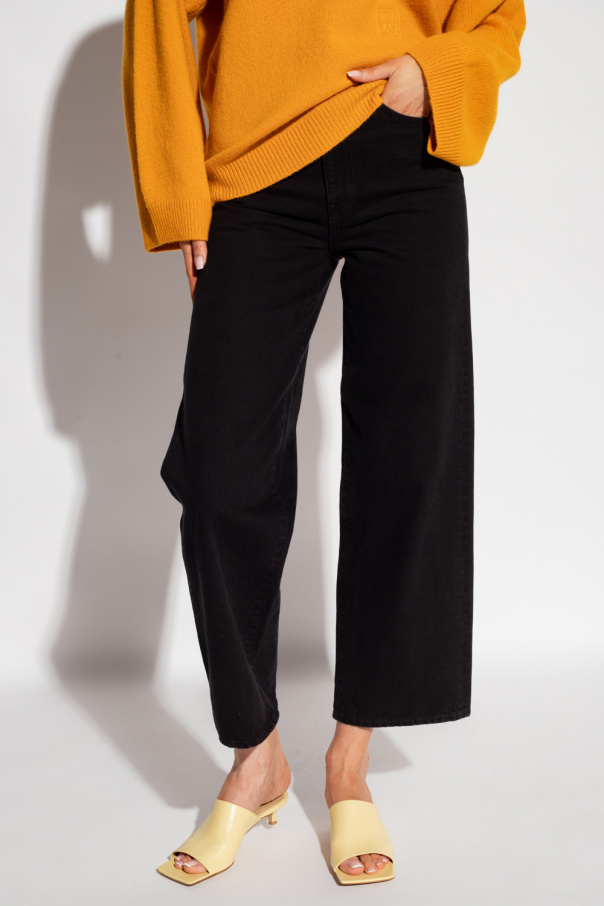 Black high-waisted jeans from Toteme. Made of organic cotton, this pair falls down with wide, cropped legs and is complete with a zip and button closure, monogram embroidery and five slip pockets.