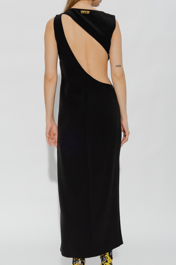Black sleeveless dress from Versace Jeans Couture. Fastened with a concealed side zip, this design features a yellow, brown and white Logo Couture pattern, gold-tone metal logo appliqué, decorative cut-outs and high slit.