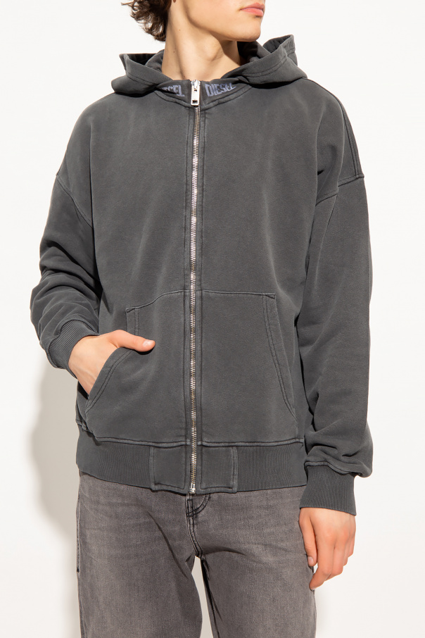 Grey ‘S-NEKKI-JAC’ hoodie from Diesel. Crafted from cotton jersey, this style features a zip fastening, a white logo graphic, two slip pockets and elasticized trims on the bottom hem and cuffs.