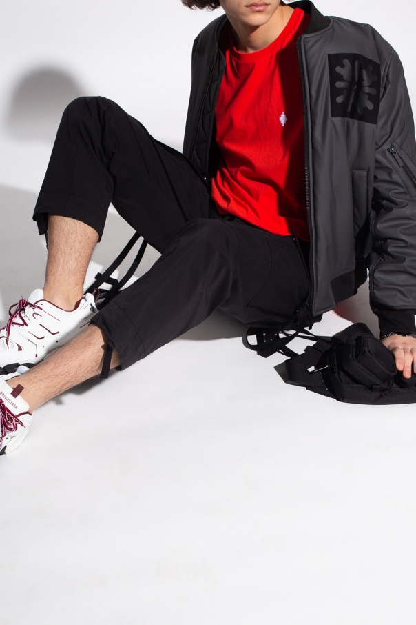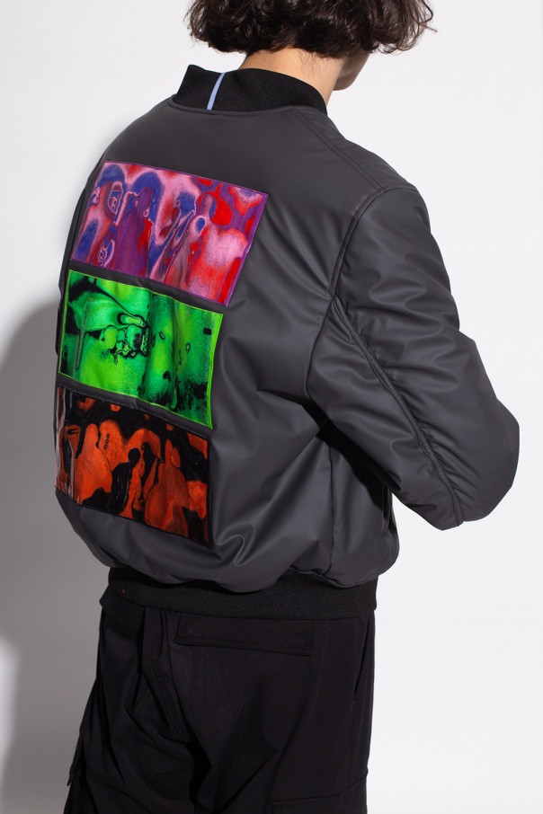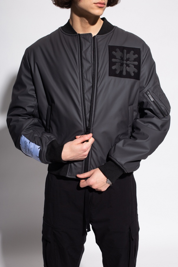 Grey and black bomber jacket from McQ, ‘No. 0’ collection. Fastened with a zip, this design features logo appliqués, two snap-fastened front pockets, ribbed trims and five pockets, including one zipped.