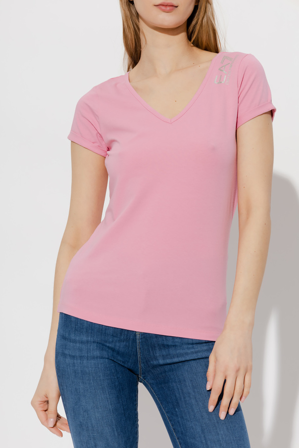 Pink V-neck T-shirt from EA7 Emporio Armani. Crafted from cotton with a slim-fitting silhouette, this style features a silver-tone logo printed on the front, short sleeves and piping on the neckline.