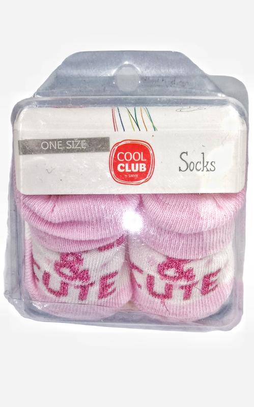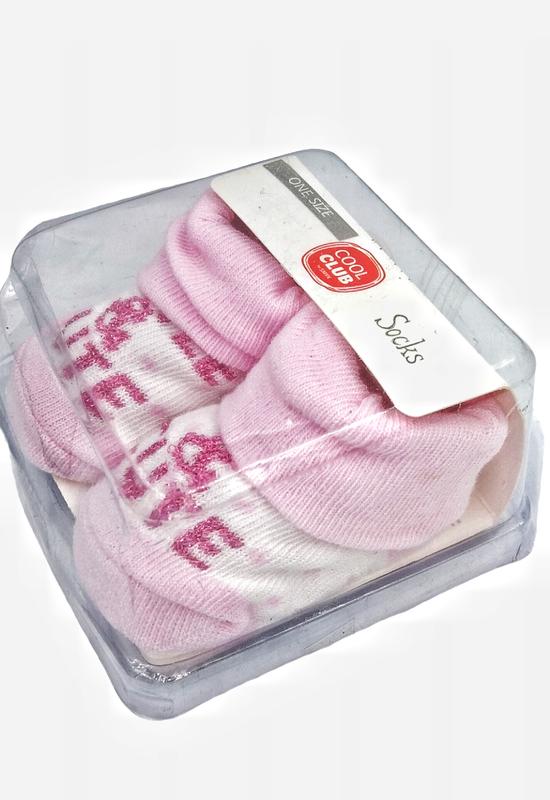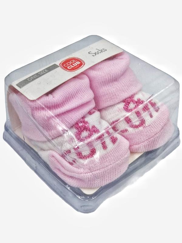 Цвет носочков: розовый; надпись из блестящей розовой ниточки.