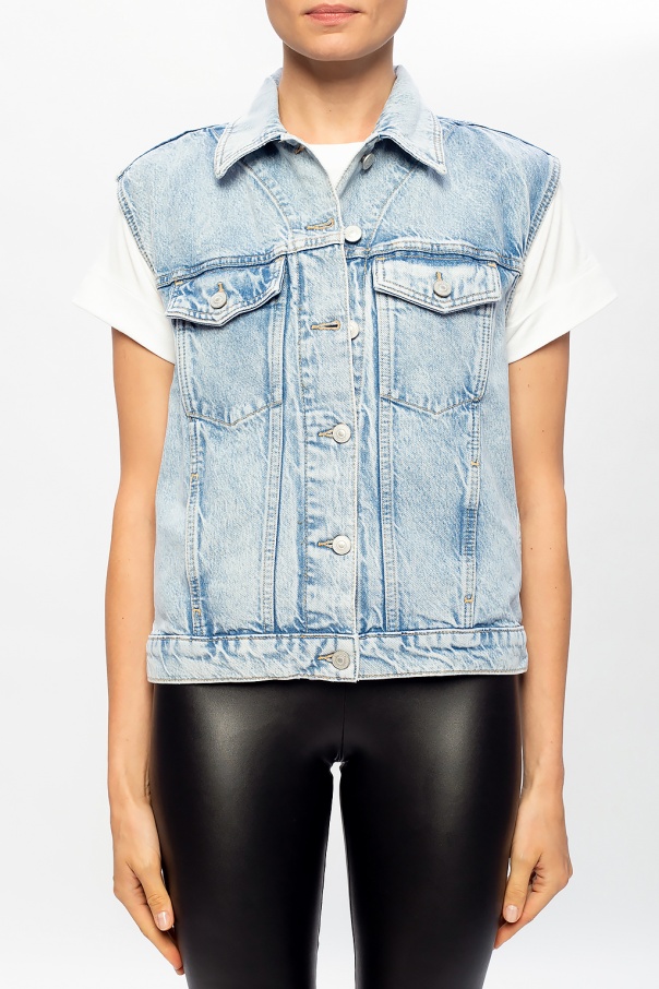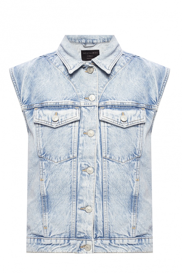 Blue ‘Alva’ denim vest from AllSaints. Fastened with buttons, this garment has two slip pockets and two buttoned flap pockets on the front.