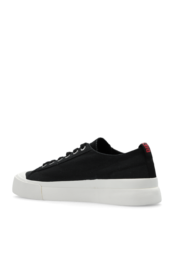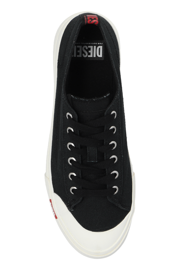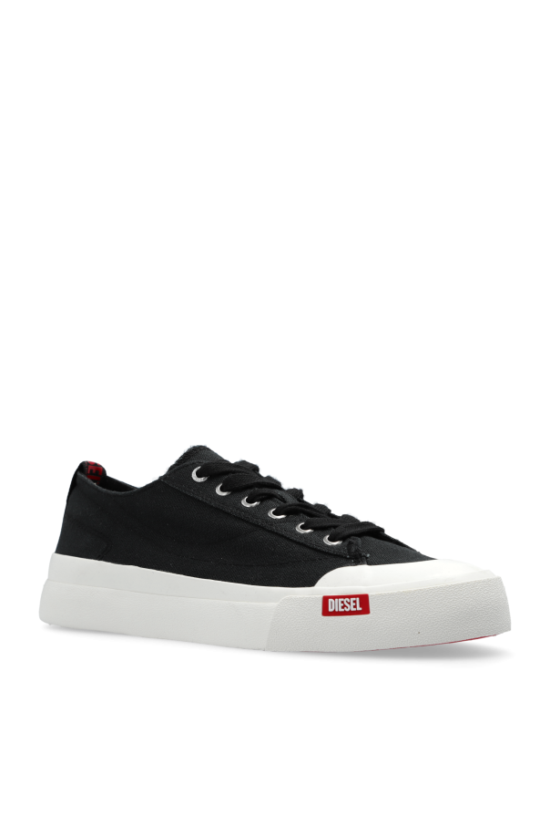 Introducing the ‘S-ATHOS’ sneakers by Diesel, an epitome of modern elegance and minimalist design. Crafted from premium canvas-like fabric, these sneakers embody sophistication in a dominant black hue, seamlessly contrasted by a robust white rubber sole. The ‘S-ATHOS’ sneakers feature a classic low-top silhouette, with a rounded toe cap accentuated by a white rubber guard. The black laces threaded through six metal eyelets ensure a secure and stylish fit, while the interior, also in black, boasts a cushioned insole emblazoned with the Diesel logo in white. Signature Diesel branding adorns the sneakers, with a red rectangle and white inscription \"DIESEL\" on the toe guard, and a matching red \"DIESEL\" logo on the heel, adding a touch of distinctive charm. Why Choose This Product? Crafted from high-quality, durable materials for long-lasting wear. Elegant black color with a striking white sole for a contemporary look. Comfortable interior with a cushioned insole for all-day wear. Iconic Diesel branding for a touch of exclusivity.