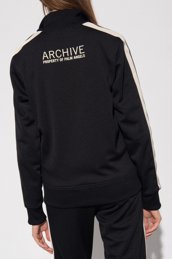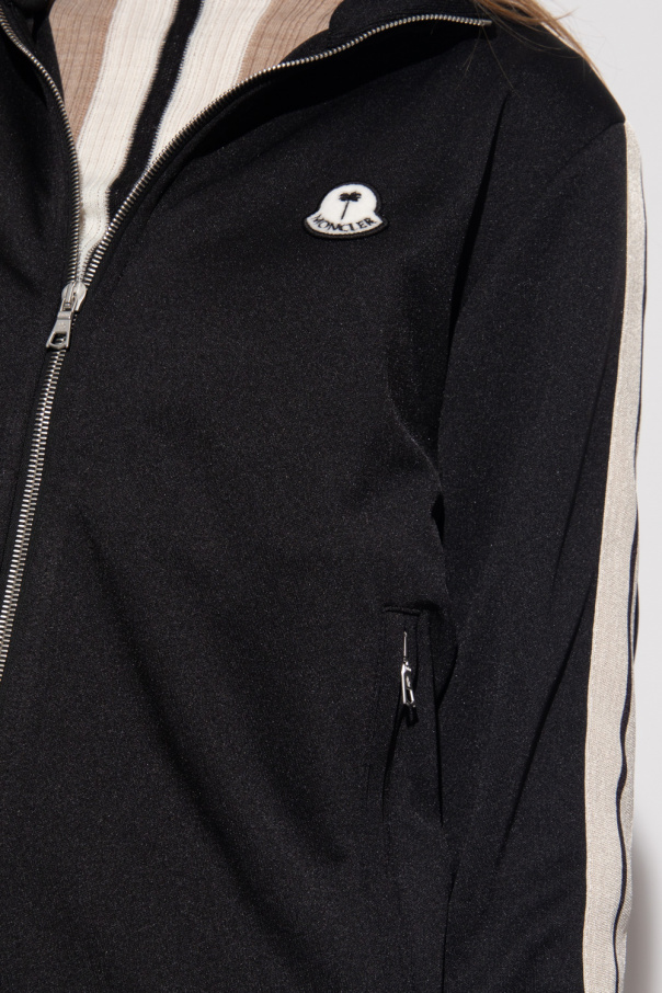 Black sweatshirt from Moncler Genius, the ‘Palm Angels No. 8’ collection. Emblazoned with a black and white logo patch and beige and black panels, this style features two zipped pockets and elasticized trims on the standing collar, bottom hem and cuffs.