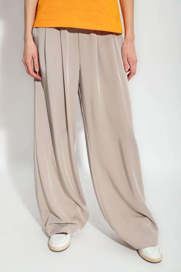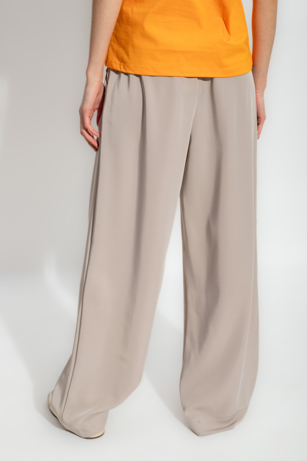 Greyish beige ‘Sloan’ trousers from Gestuz. Crafted from recycled material, this pair falls with wide legs and features an elasticated waistband, decorative pleats and two slip pockets.