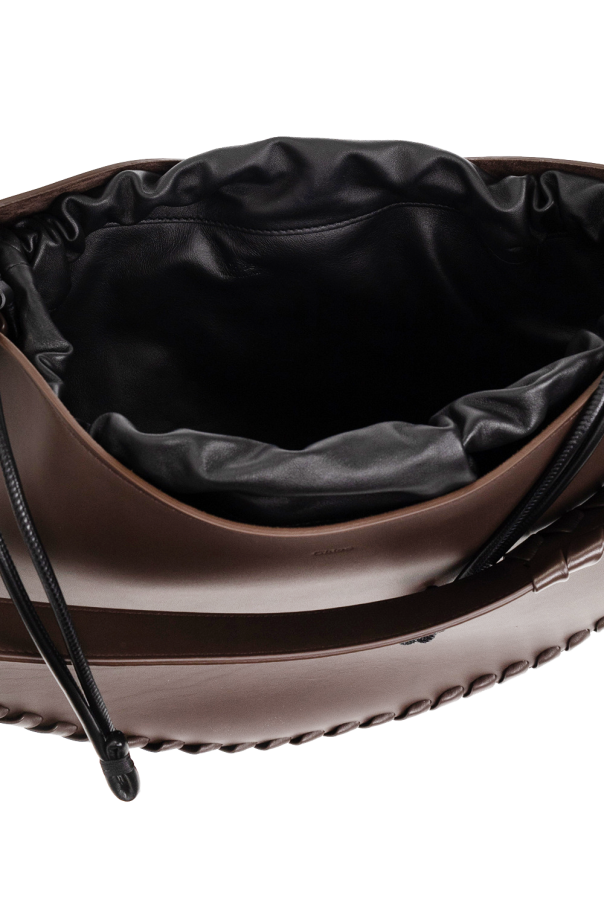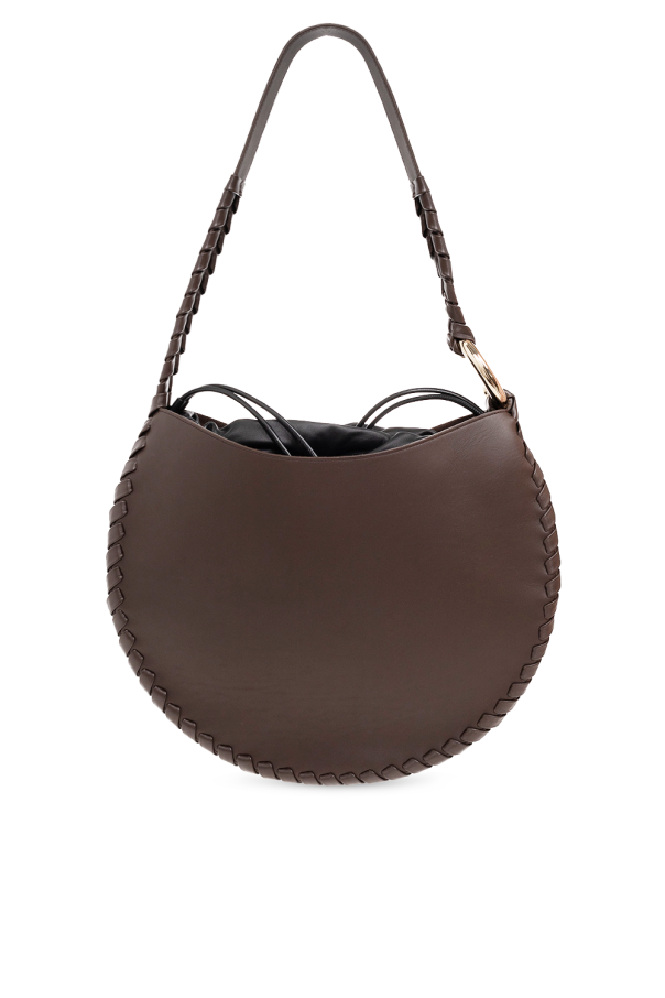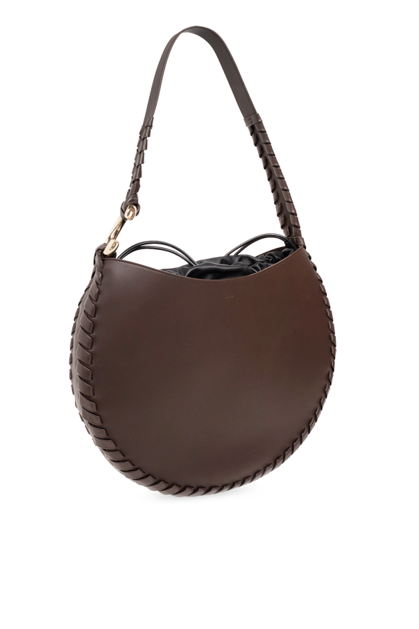 Dark brown and black ‘Mate Large’ hobo shoulder bag from Chloe. Crafted from calf leather, this design cinches closed with drawstrings on the sides and features distinctive stitching details, an embossed logo on the side, one internal compartment and a shoulder strap accentuated with a gold-tone logo application.