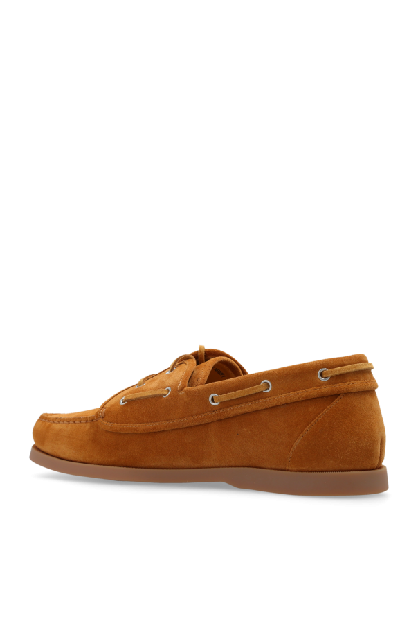 Brown shoes from Bally. Made from suede, this lace-up model sits on a brown rubber sole and showcases a signature logo label sewn on the side and exposed stitching details.