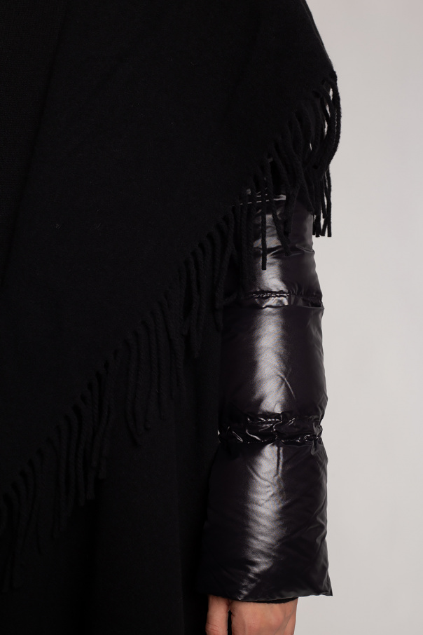 Black ‘Mantella’ coat with a collar from Moncler. Crafted from wool trimmed with quilted fabric, this design features fringes, a cream, navy and red logo patch at the shoulder and long sleeves with drawstring cuffs.