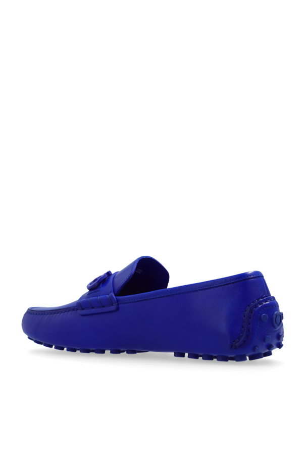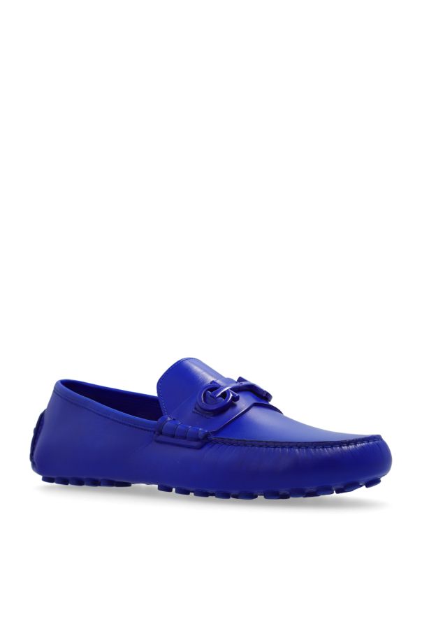Blue ‘Grazioso’ moccasins from FERRAGAMO. Made from smooth calf leather, this model sits on a blue rubber sole and showcases a blue Gancini application on the front and an extra-wide insole.