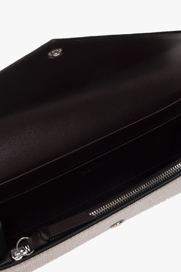 Pink and silver-tone shoulder wallet from Ganni. Enriched by an engraved logo, this design features a snap fastening, a detachable shoulder strap, silver-tone metal hardware and one internal compartment with one zip pocket and two slip pockets.