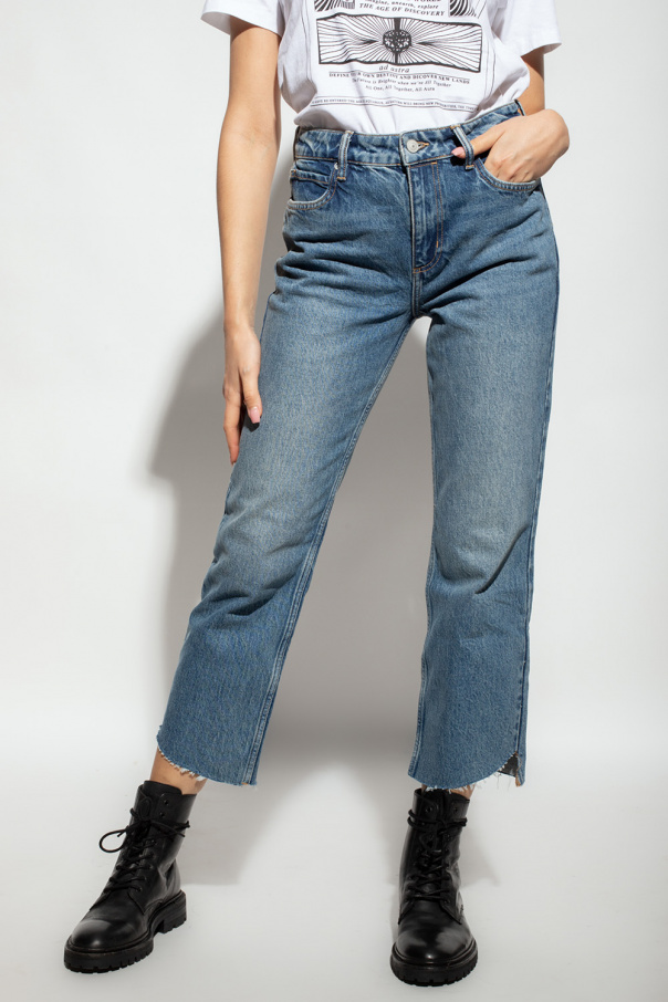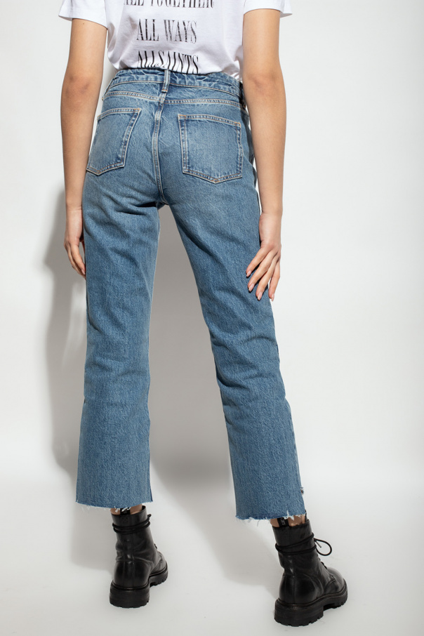 Blue ‘Barely’ jeans from AllSaints. Made of cotton, this pair falls down with straight legs and is complete with a zip and button closure, five slip pockets and raw cut edges.