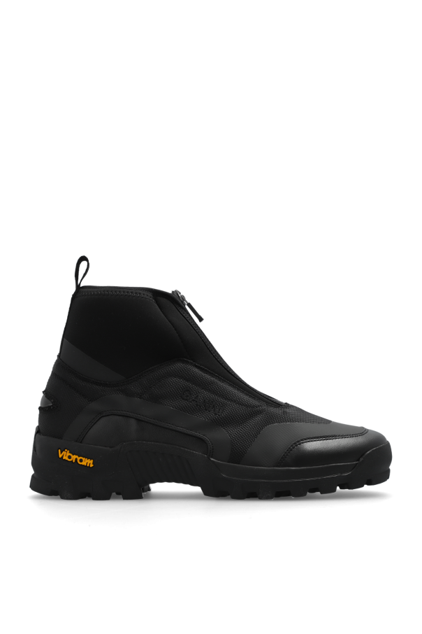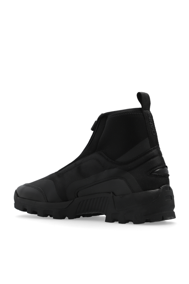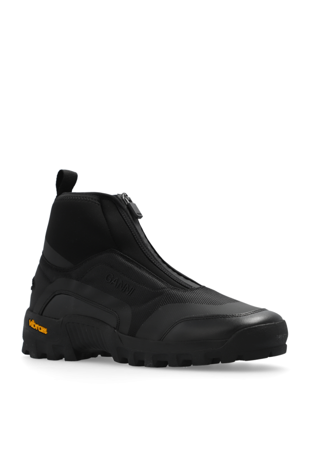 Black sneakers from Ganni. Made of fabric, this model sits on a black Vibram rubber sole and features a logo pattern and a zip fastening.