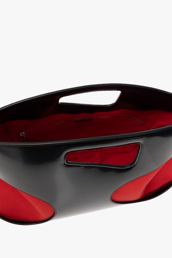 Black and red ‘Cut Out’ shopper bag from FERRAGAMO. Made of calf leather and canvas, this design features asymmetric cut-outs on the front and back, embossed logo, two handles, detachable and adjustable shoulder strap and one internal compartment with two slip pockets and one zip pocket.