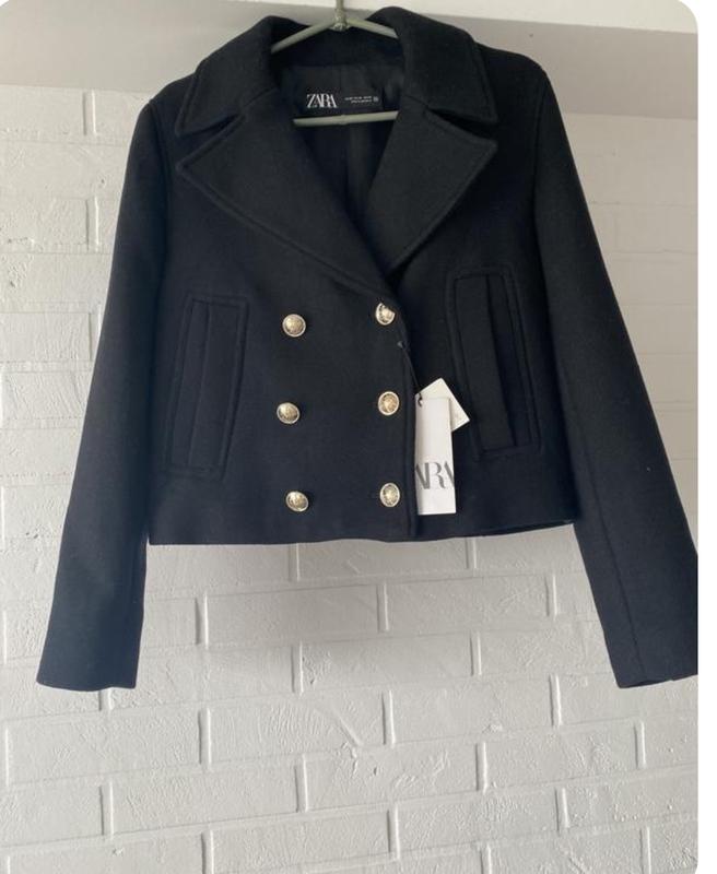 Укороченное двубортное пальто из смесовой шерстяной ткани с лацканами и длинными рукавами. Застегивается на пуговицы спереди. Прорезные карманы спереди.