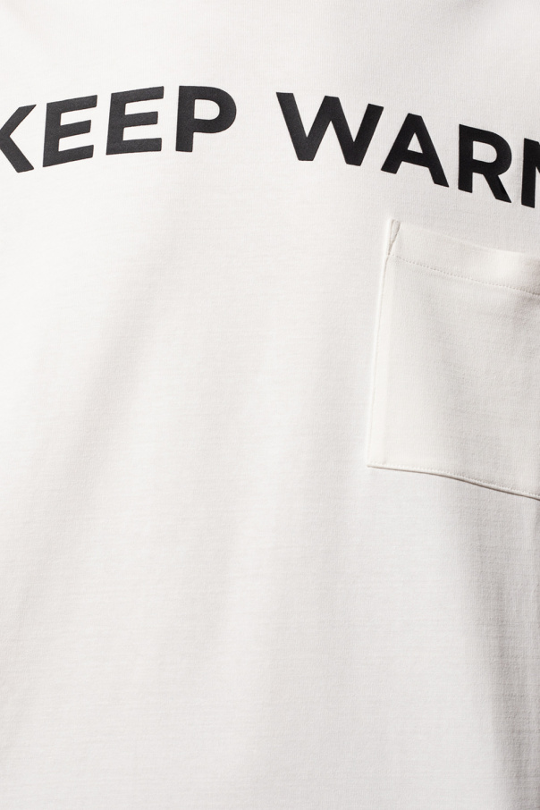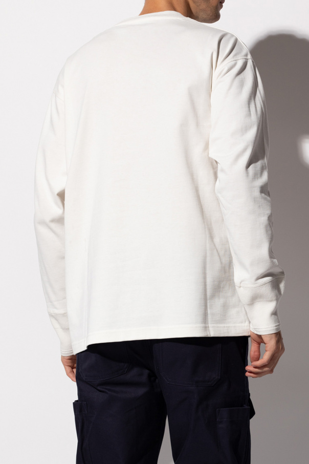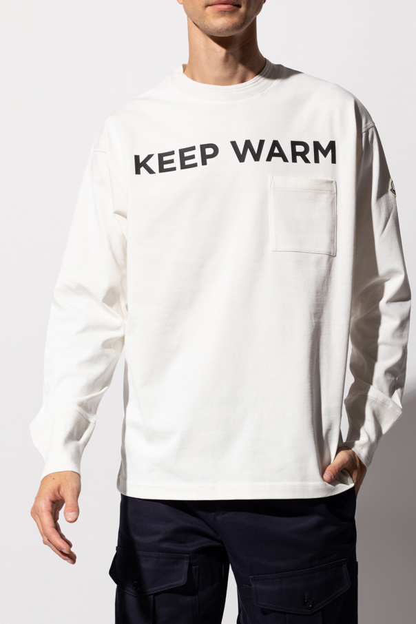 Cream crewneck T-shirt from Moncler. Made of cotton, this long sleeve design features a front pocket, black lettering print, ribbed trims at the neck and cuffs as well as a cream sleeve patch embroidered with a navy and red logo.