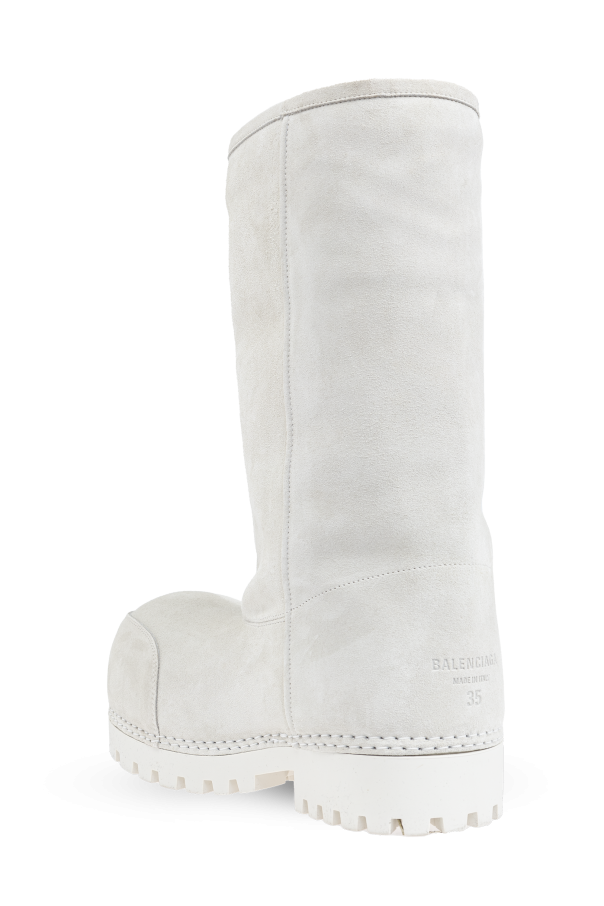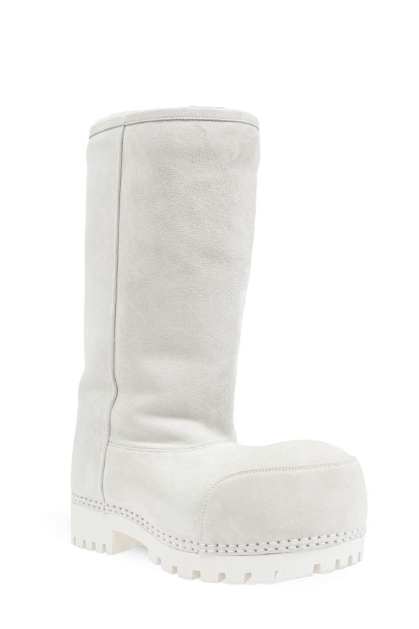 Introducing the ‘Alaska Fur High’ snow boots by Balenciaga, a testament to luxury and functionality seamlessly woven into one. Crafted with an exquisite outer layer of calfskin leather that mimics the soft, matte finish of suede, these cream-colored boots are a pinnacle of high-end winter wear. The boots feature a high shaft that gracefully extends midway up the calf, ensuring both warmth and elegance. The thick sole, adorned with a pronounced tread pattern, is stitched on, promising durability and superior traction in challenging weather conditions, from deep snow to slick mud. The interior is lined with a soft, insulating material, providing snug comfort while braving the cold. Distinctively, the side of the shaft is embellished with the iconic \"BALENCIAGA\" logo and the size \"35,\" signifying its illustrious brand and attention to detail. Why purchase the ‘Alaska Fur High’ snow boots? Exclusive Design: Stand out with Balenciaga\'s cream-colored elegance and high-caliber craftsmanship. Supreme Comfort: Enjoy the cozy warmth offered by the premium internal materials, perfect for cold climates. Enhanced Durability: The robust, treaded rubber sole ensures long-lasting wear and slip-resistant safety. Signature Appeal: Showcase your taste with the distinguished Balenciaga logo, a symbol of luxury and style.