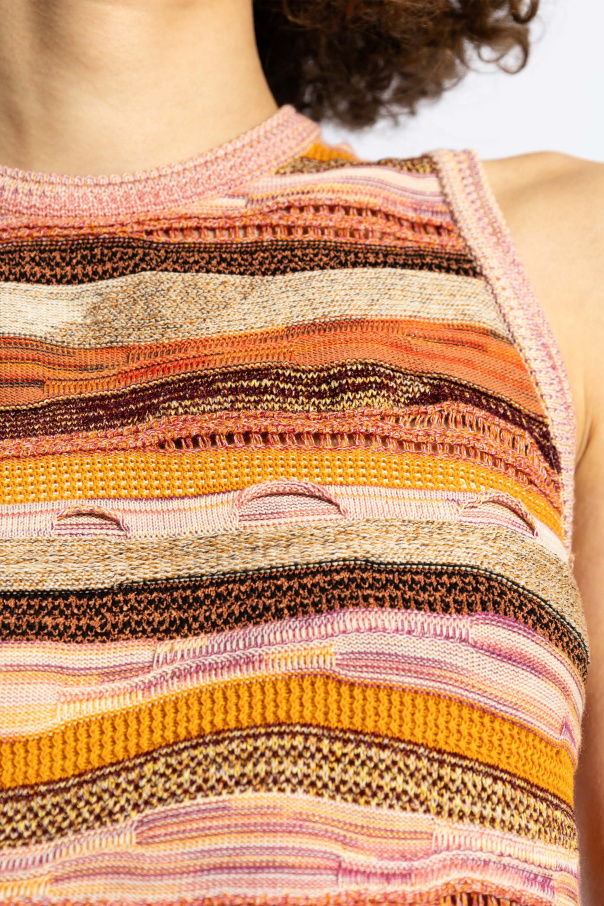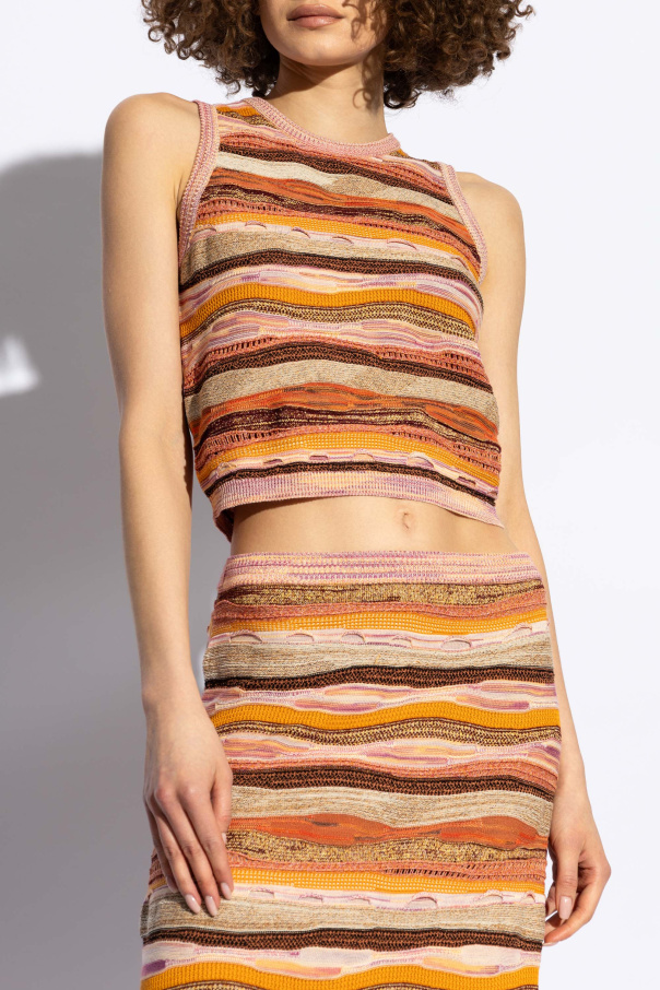 Introducing the Miri Top by Ulla Johnson, a masterpiece of textile artistry that mesmerizes with its vibrant multicolor palette. Dominated by hues of orange, pink, yellow, and brown, this piece is a celebration of color and pattern. Its dynamic character is accentuated by horizontal stripes of varying widths and textures, hinting at the intricate, possibly handcrafted nature of its design. The Miri Top is sleeveless, featuring a flattering round neckline that complements its fitted silhouette, meticulously designed to enhance the body\'s contours. Notably, the absence of visible side seams suggests an advanced seamless construction or exceptionally concealed stitching, aligning with the garment\'s premium aesthetic. The absence of overt branding speaks to a philosophy of understated elegance. Crafted from a blend of materials including 75% Cotton, 10% Linen, 9% Viscose, 4% Nylon, and 2% Silk, the top offers a tactile experience of softness and flexibility, ensuring comfort without compromising on style. The fabric\'s texture, with its variety of weaves and subtle irregularities, underscores the uniqueness and high quality of the garment. Why Choose the Miri Top? Exquisite Multicolor Design: Stand out in a top that celebrates vibrant colors and patterns. Elegant Construction: Enjoy the sophistication of seamless design and a silhouette that flatters. Luxurious Material: Relish in the comfort and elegance of a meticulously chosen fabric blend. Understated Branding: Embrace the luxury of subtlety in a world loud with logos.