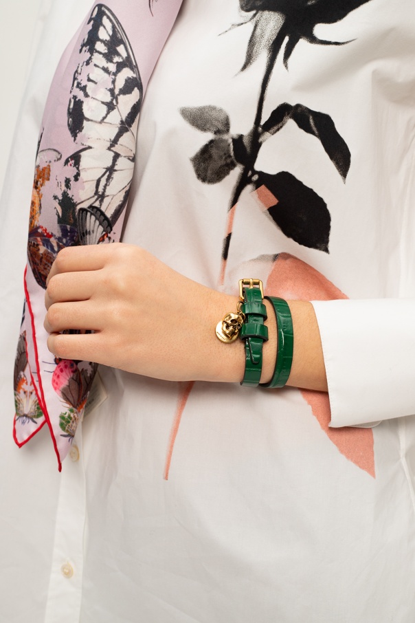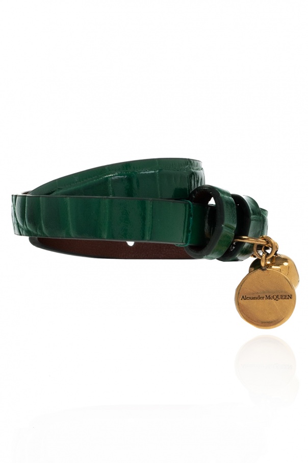 Green bracelet from Alexander McQueen. Crafted from leather, this double-wrap accessory employs buckle fastening with the brand\'s iconic skull details and silver-tone metal finish.