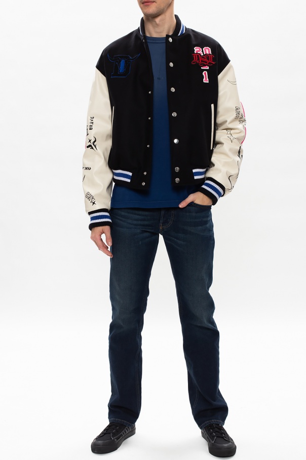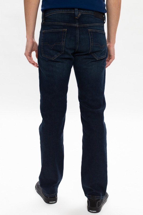 Navy blue ‘Larkee-X’ jeans from Diesel. Crafted from stretchy cotton denim, this pair falls down with straight legs and features a button fastening with a concealed placket and classic five pockets.