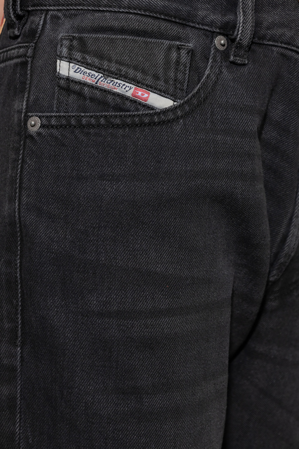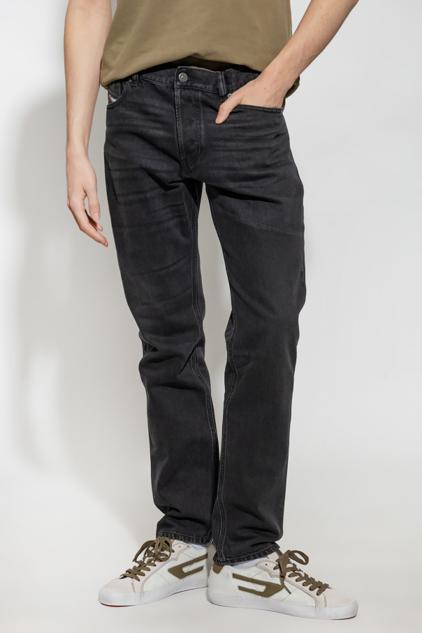 Black ‘1995’ jeans from Diesel. Crafted from cotton, this pair falls down with tapered legs and is complete with button fastenings, five slip pockets and beige logo patch at the back.