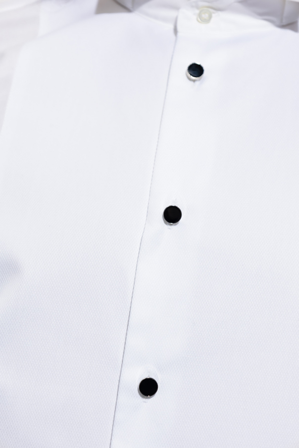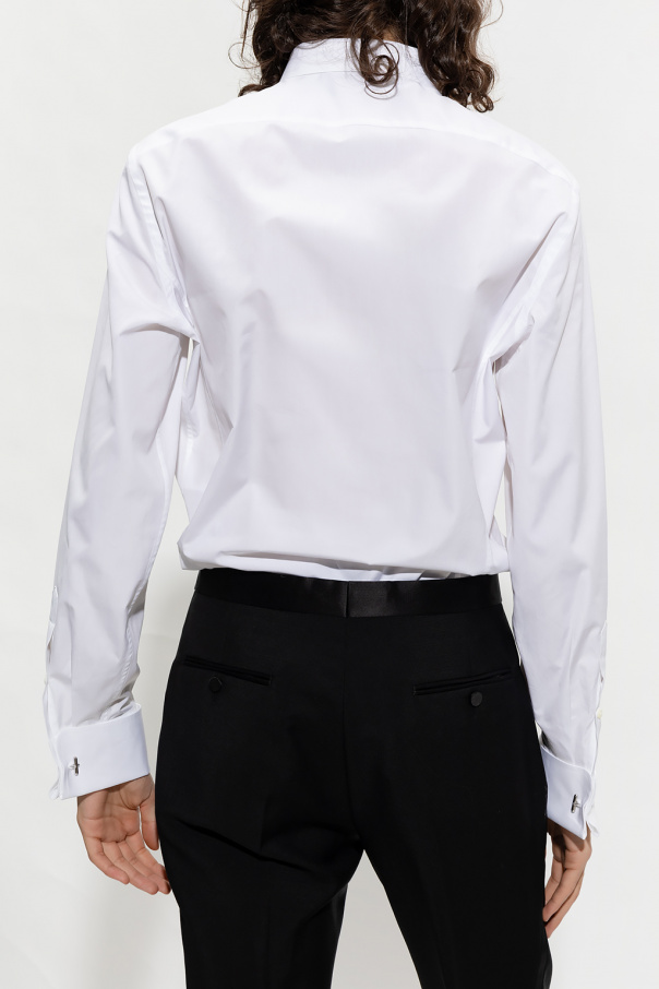 White shirt from Gucci. Made of cotton, this style features decorative buttons and long sleeves with cuff link closures on the cuffs.
