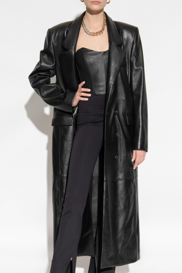 Black ‘Greenock’ coat from The Mannei. Crafted from leather with a long fit, this style features a double-breasted button fastening, a collar with notch lapels, one slip pocket and two flapped pockets on the front, one buttoned pocket at the back, padded shoulders, a single back vent and long sleeves with decorative buttons on the cuffs.