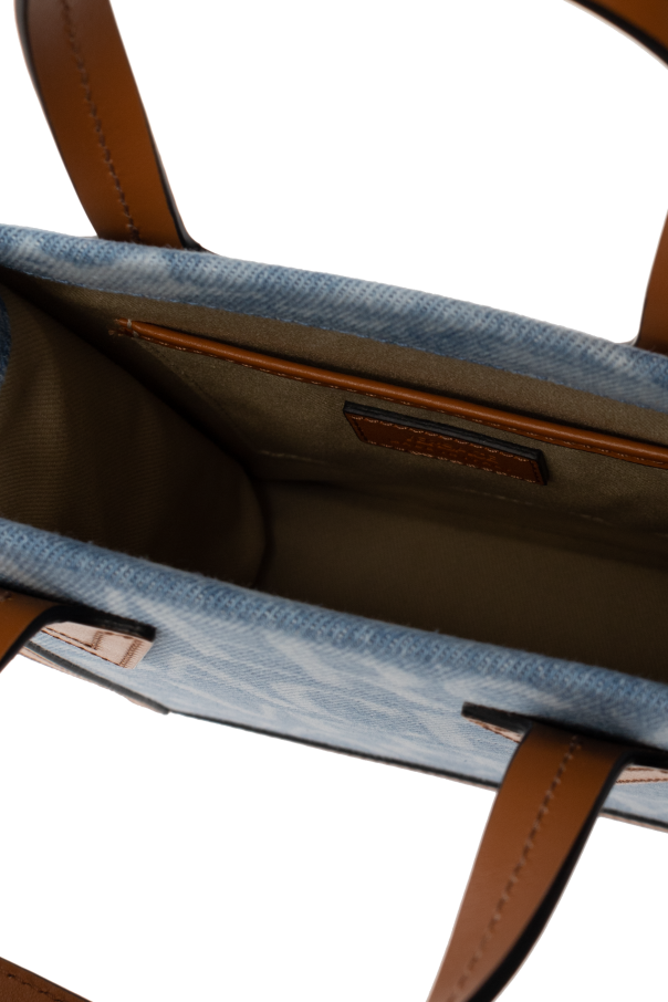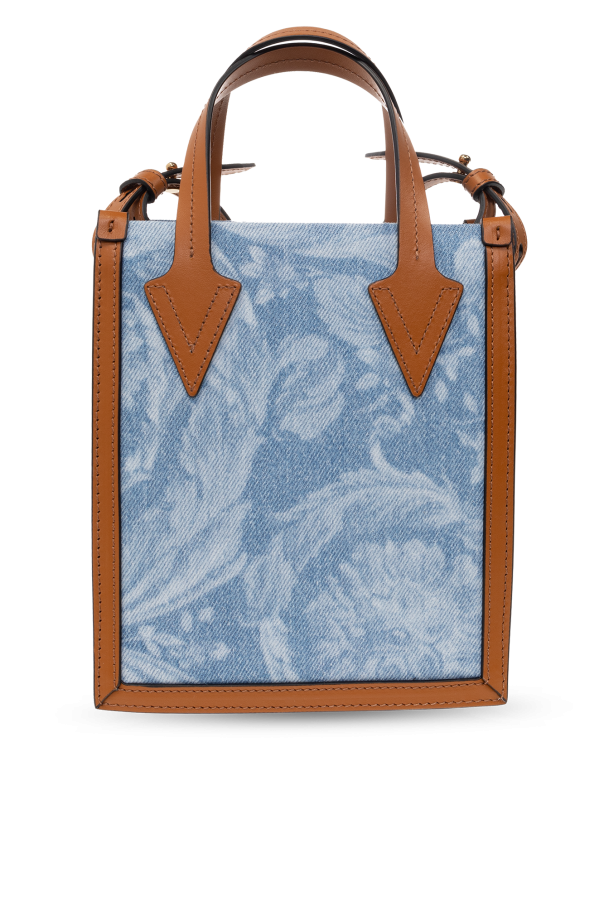 Blue and brown shopper bag from Versace, ‘La Vacanza’ collection. Crafted from denim decorated with the Versace Allover pattern and leather trims, this model is complete with two half-round handles, an adjustable strap, gold-tone metal hardware and one intenral compartment with one slip pocket.