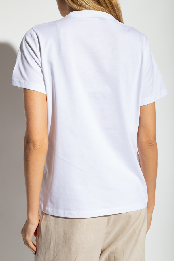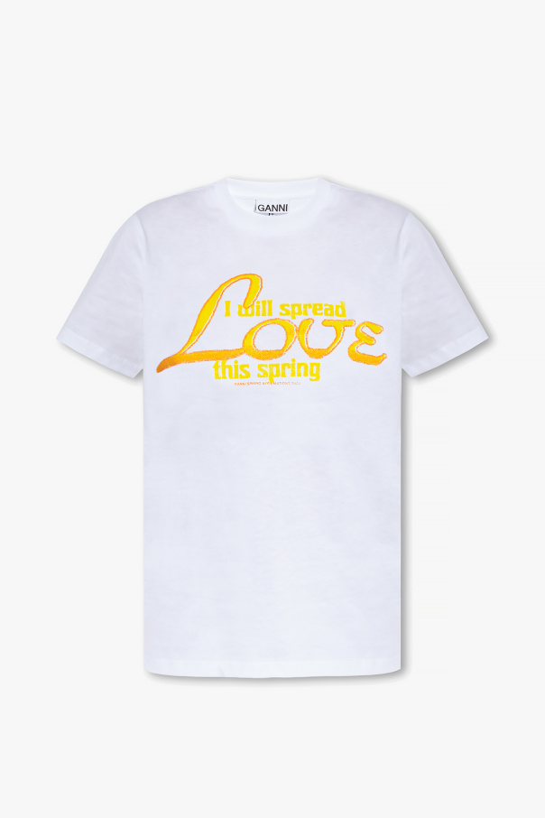 White crewneck T-shirt from Ganni. Made of cotton, this short sleeve design is decorated with a logo and print in yellow and orange.