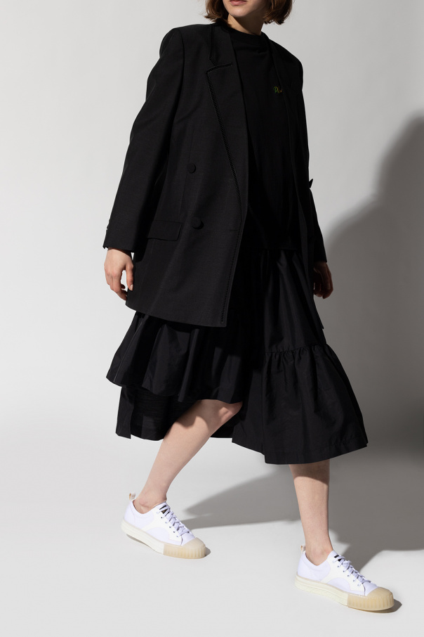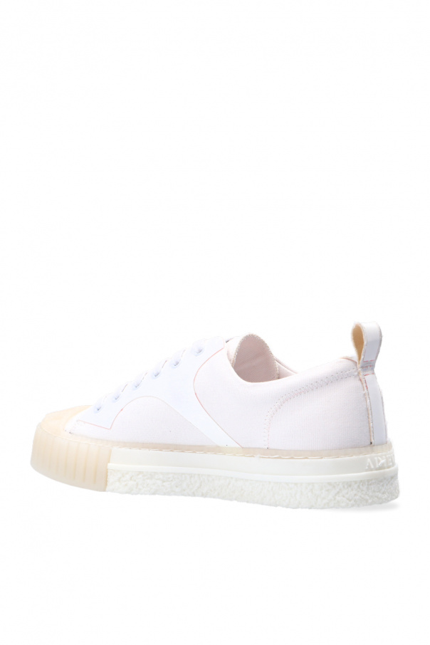 White ‘Type W.O. Mask’ sneakers from Adieu. This lace-up pair features a tongue patch with a logo, ribbed toe and cream rubber sole.