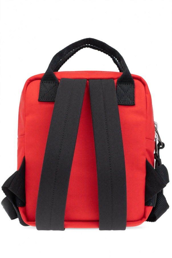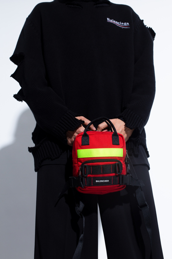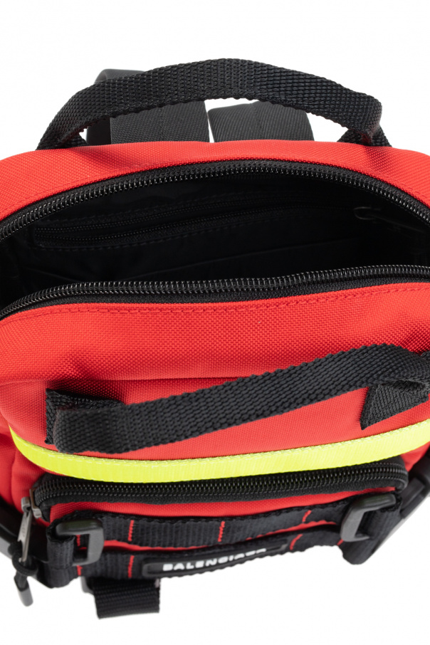 Red ‘Fireman XS’ backpack from Balenciaga. Emblazoned with a rubberised appliqué with a raised white logo, this design features a two-way zip fastening, an external zip pocket on the front, decorative buckle tabs and a neon yellow strap, two half-round handles, adjustable shoulder straps and one internal compartment with one slip pocket and one zip pocket.