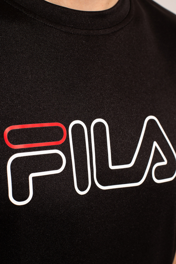 Black crewneck training T-shirt from Fila. Spun from synthetic yarns, this item features a white and red graphic print with the brand's logo.