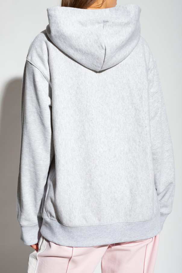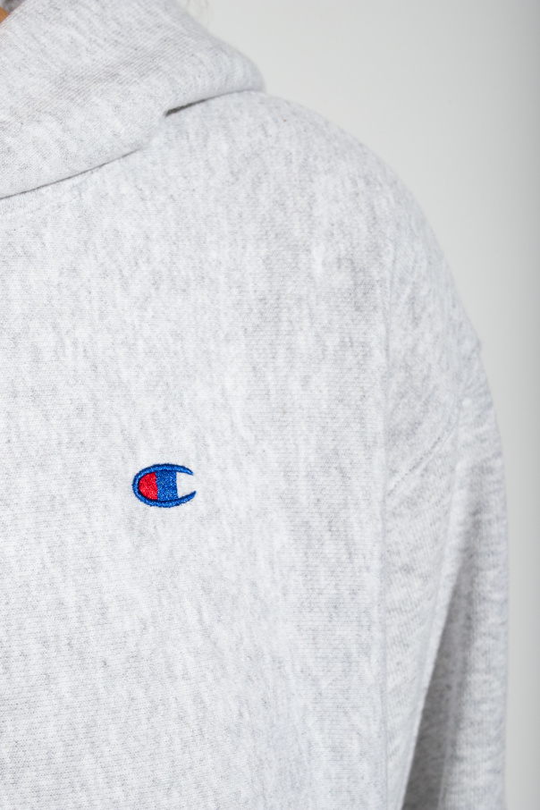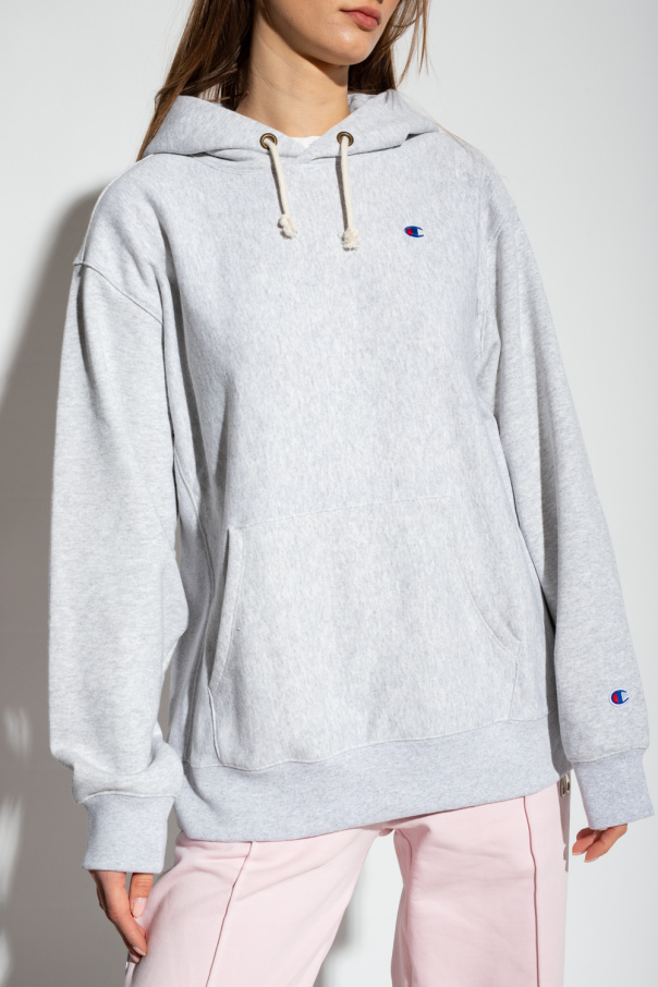 Grey hoodie from Champion. This garment features a drawstring hood, logo details, slip pocket and ribbed trims at the hem and cuffs.