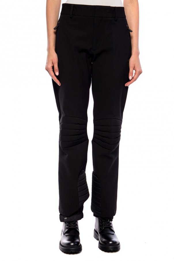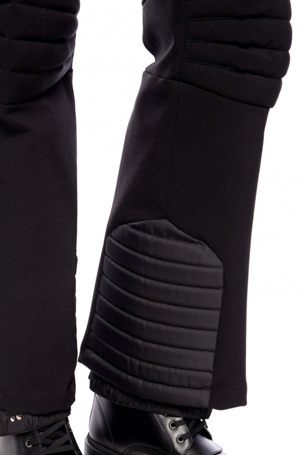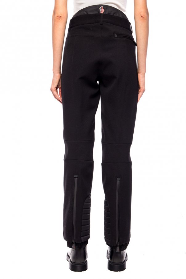 Black ski trousers from Moncler Grenoble. Fastened with a metal hook, a button and a zip. Decorated with ribbed inserts in black and grey. Two zip pockets on the front. Wide legs with sewn-in zippers.