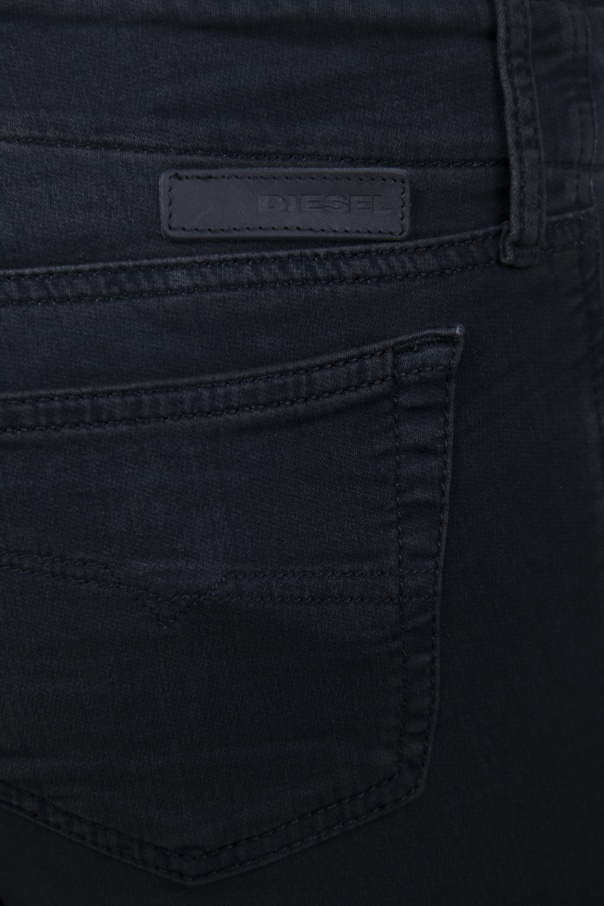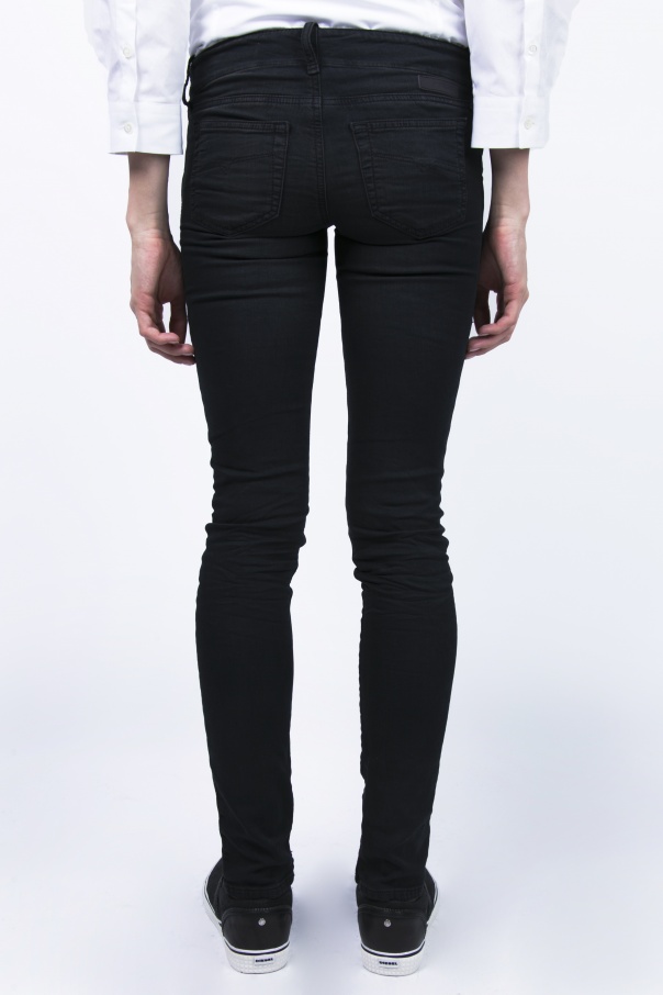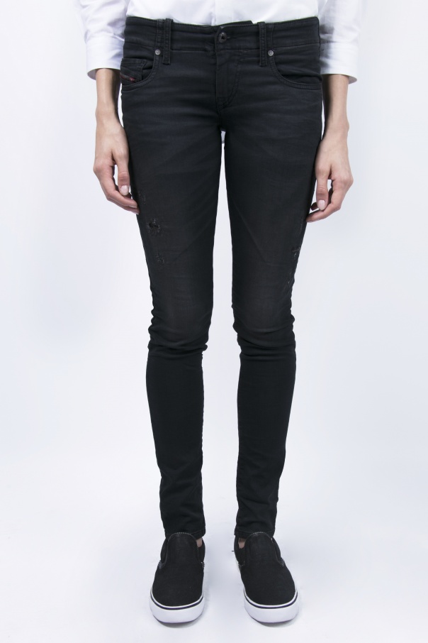 Black 'Grupee-Ne' low-waisted trousers from Diesel. Washed and distressed effect. Soft and elastic denim-imitated fabric patented by Diesel. Zipped fastening. Skinny fit. Cuffs split.