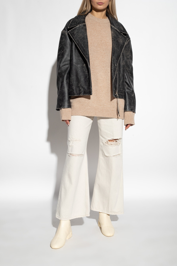 Cream ‘Solaris’ heeled ankle boots from Raf Simons. Crafted from leather, this model sits on a cream rubber sole and showcases a back velcro closure, logo detailing and elastic panels on the sides.