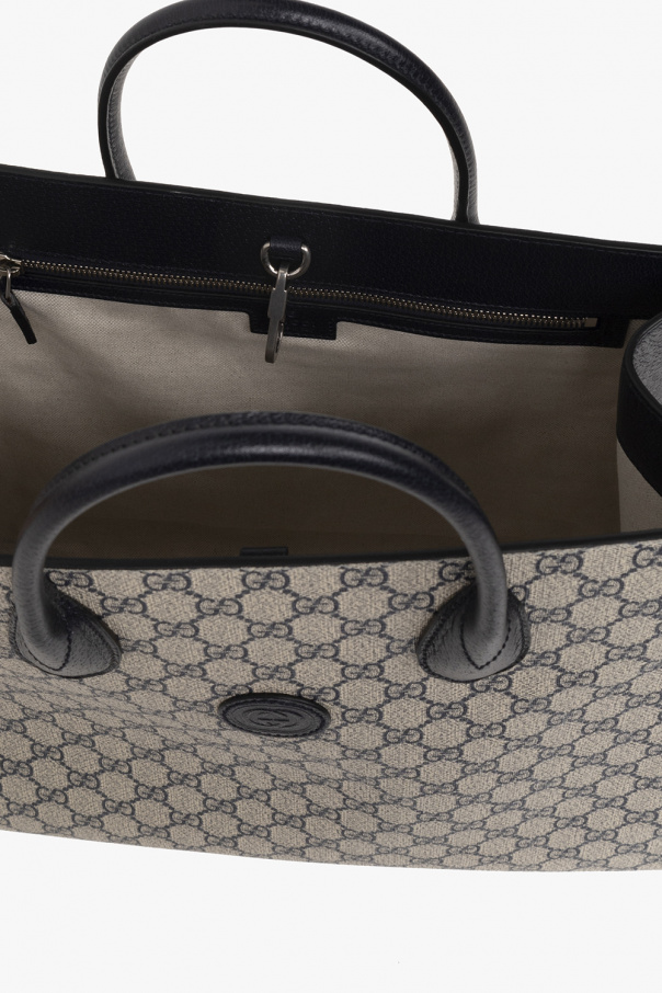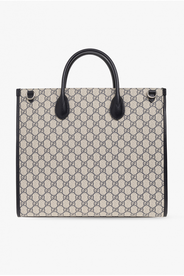 Navy blue and beige shopper bag from Gucci. Crafted from ‘GG Supreme’ canvas and trimmed with leather, this design features a lobster clasp fastening, a logo patch on the front, two half-round handles, a detachable and adjustable strap, silver-tone metal hardware and one internal compartment with a zip pocket.