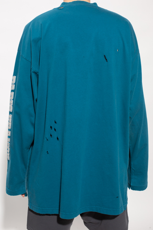 Green and blue crewneck T-shirt from Balenciaga. Made of cotton, this style features long sleeves, an elasticated collar and vintage-effect graphic print with the brand\'s logo in grey, white and black.