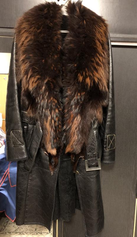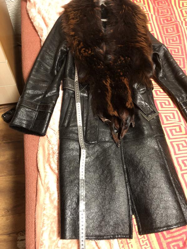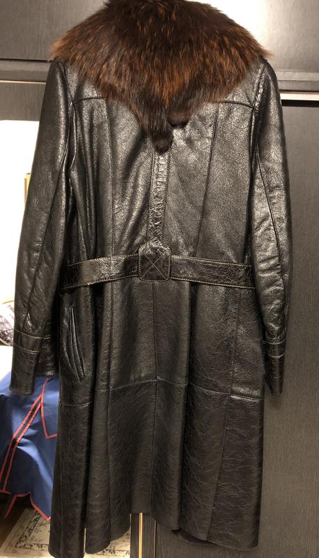 Шкіряна дублянка на хутрі. Комір єнот. Тепла та мʼяка, в гарному стані. Обʼєм грудей від пройми до пройми 45см, довжина рукава 61см, загальна довжина 97.