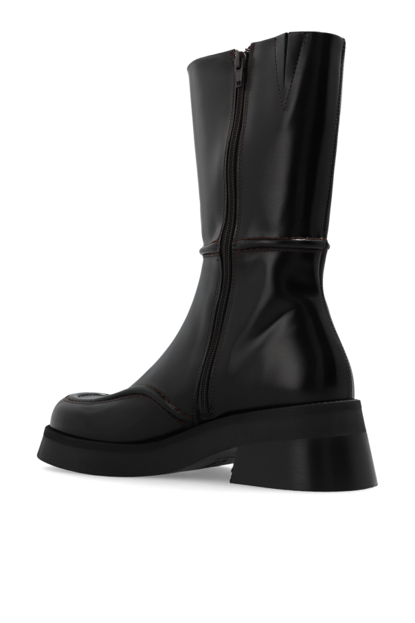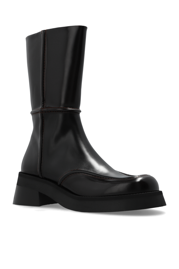 Introducing the distinguished Inne Ankle Boots from the esteemed Miista collection. Crafted with meticulous attention to detail, these boots epitomize sophistication and versatility. Designed by the renowned Laura Villasenin, each pair is a testament to the harmonious blend of traditional craftsmanship and contemporary aesthetics. Exquisitely fashioned from glossy, high-quality black leather, the Inne Ankle Boots feature a classic, streamlined silhouette with a rounded toe and mid-calf height. The contrast stitching in rich brown adds a touch of elegance and structure, while the side zipper ensures effortless wearability. The robust sole, paired with a moderate heel, offers optimal comfort and stability, making these boots suitable for both refined and everyday ensembles. Internally, the boots are lined with luxurious leather and proudly display the Miista logo, underscoring the designer\'s commitment to quality. From the bustling streets of East London to the scenic coastlines of Spain, Miista\'s creations are a celebration of dynamic, modern femininity. Why Choose This Product? Timeless design that complements both elegant and casual outfits. High-quality materials for durability and luxury. Comfortable fit with a stable, moderate heel. Exclusive craftsmanship by skilled Spanish artisans. Renowned designer brand with a unique aesthetic vision.