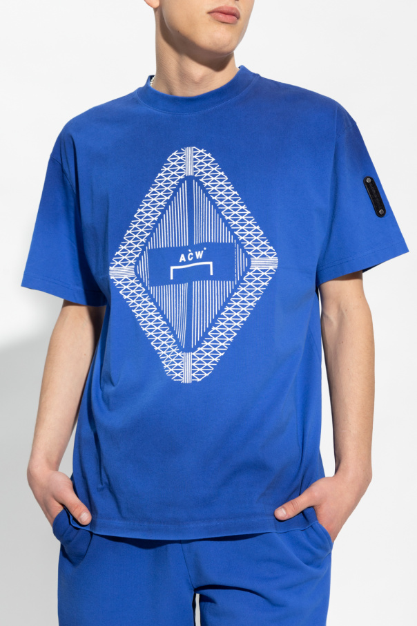 Blue crewneck T-shirt from A-COLD-WALL*. Crafted from cotton, this style features a white logo print on the front and short sleeves – one has a logo patch.