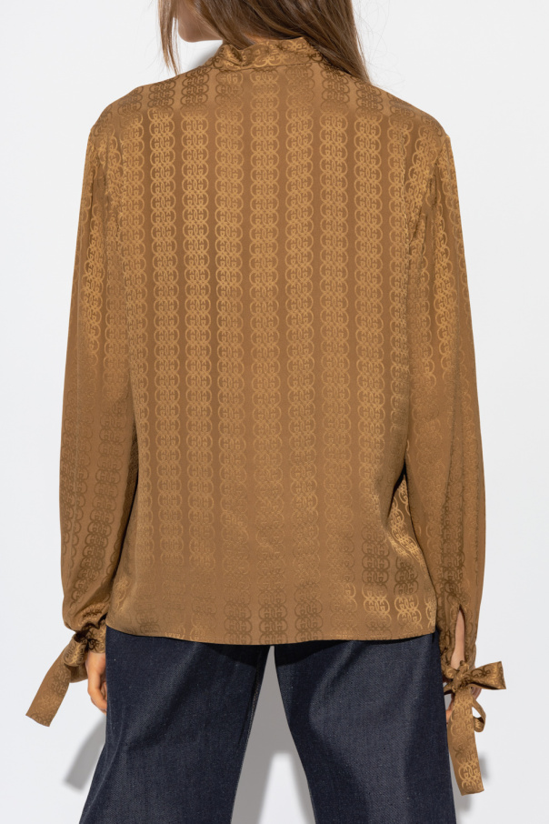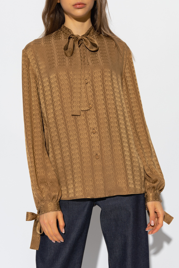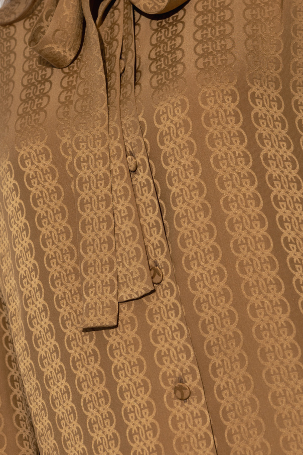 Brown shirt from Gucci. Made from silk with a relaxed silhouette, this style showcases a monogram motif, button fastenings and decorative tie details on the standing collar and cuffs.
