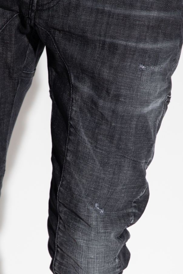 Dark grey ‘Tidy Biker’ distressed jeans from Dsquared2. Fastened with buttons, this tapered leg pair features a logo patch at the back, three front pockets and two back pockets.