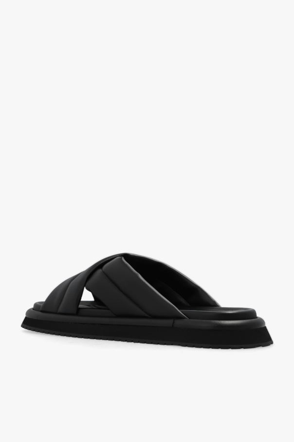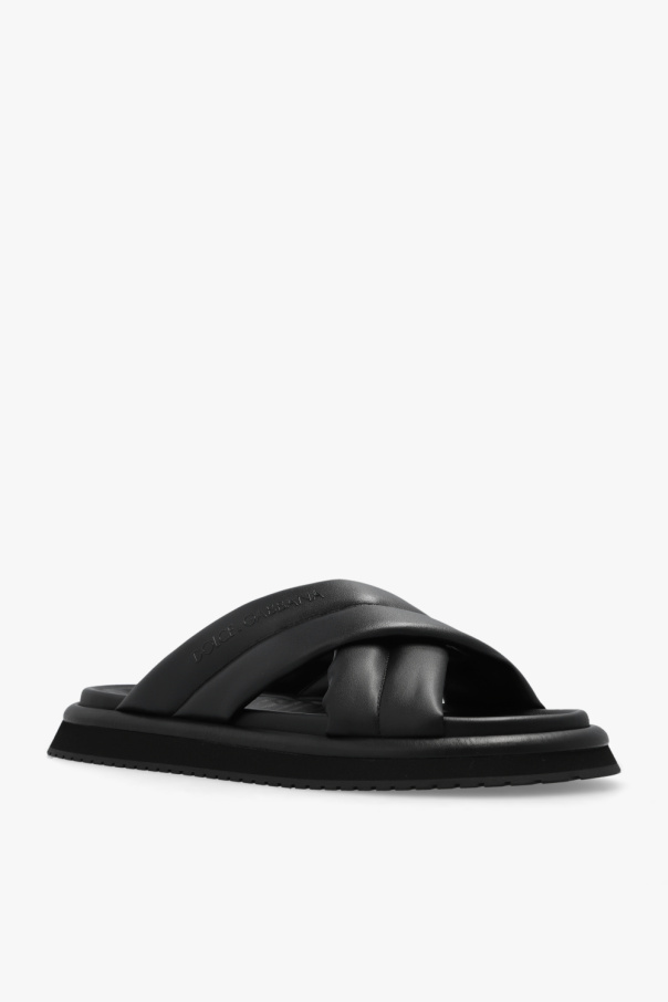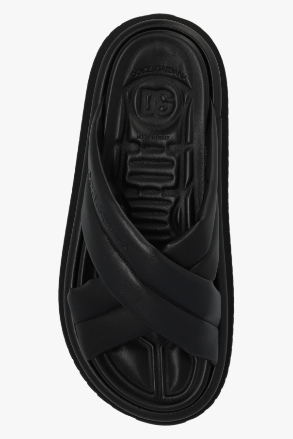 Black slides from Dolce & Gabbana. Made of faux leather, this pair features a logo detail and black rubber sole.
